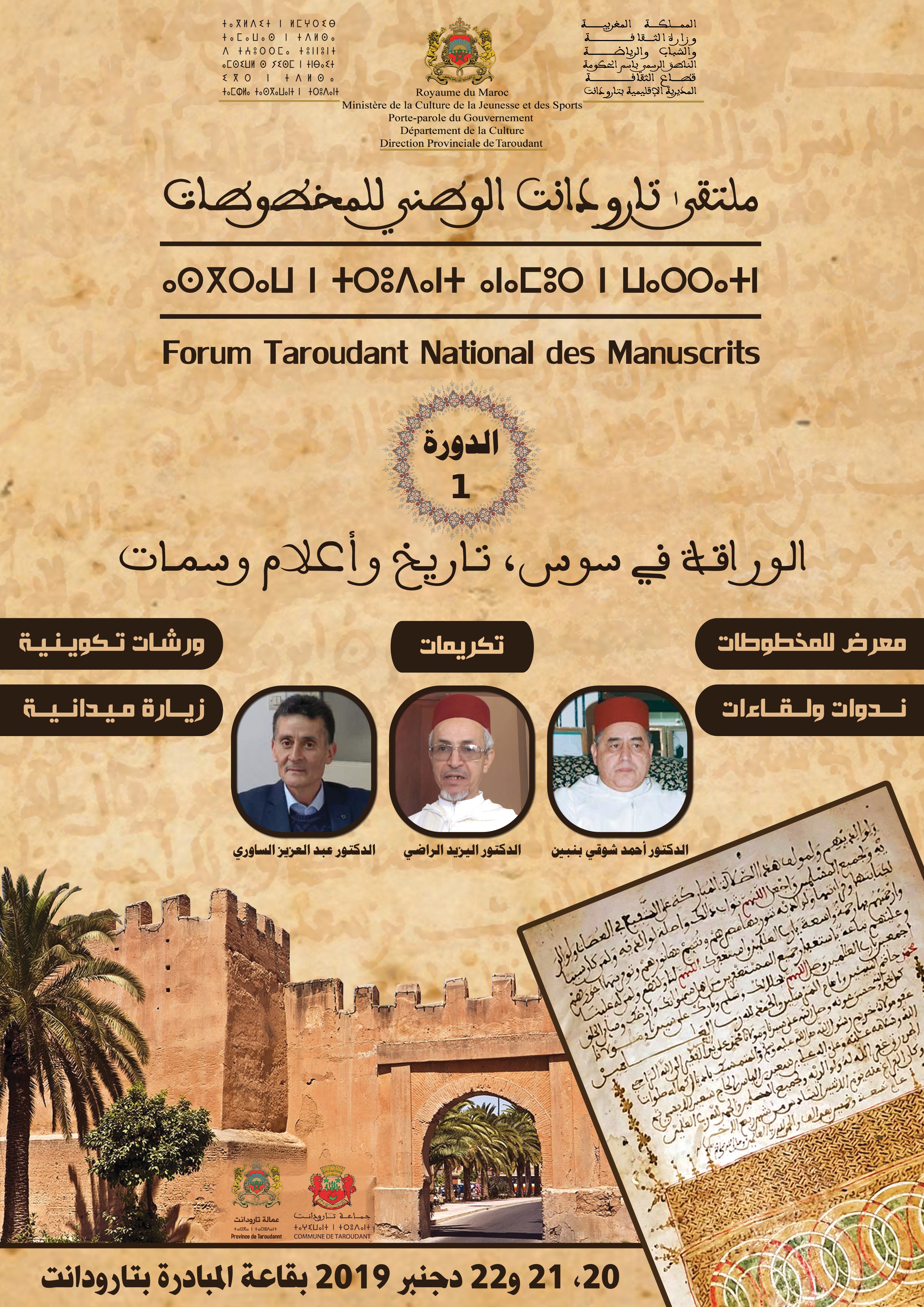 اعتبارا لكون التراث المخطوط تجليا للحضارة المغربية، والتراث العريق، ومعبرا عن الهوية الوطنية، والثوابت الفكرية، وبغية إبراز دور منطقة سوس وحاضرتها تارودانت في خدمة التراث المغربي المخطوط، جمعا وصيانة ونسخا ودراسة، وبهدف التعريف بأعلام النساخ والوراقين ممن أسهموا في خدمة العلم والمعرفة بالمغرب قديما، تنظم المديرية الإقليمية للثقافة بتارودانت بتعاون مع عمالة تارودانت وجماعة تارودانت، الملتقى الوطني الأول للمخطوطات، من 20 إلى 22 دجنبر 2019، وذلك برحاب قاعة المبادرة الوطنية للتنمية البشرية.