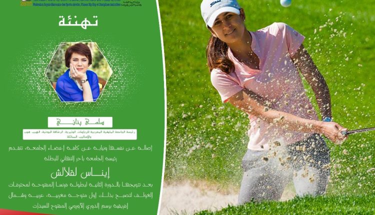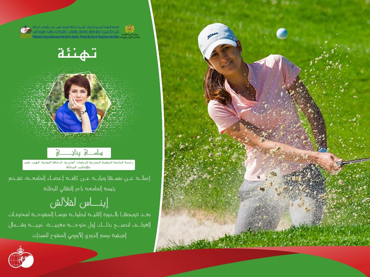 وجهت سلمى بناني رسالة تهنئة أصالة عن نفسها ونيابة عن كافة أعضاء الجامعة ، الى البطلة المغربية ايناس لقلالش بعد تتويجها بالدورة الثانية لبطولة فرنسا ، المفتوحة لمحترفات الغولف لتصبح بذلك أول متوجة مغربية عربية و شمال افريقيا برسم الدوري الاوروبي المفتوح للسيدات.