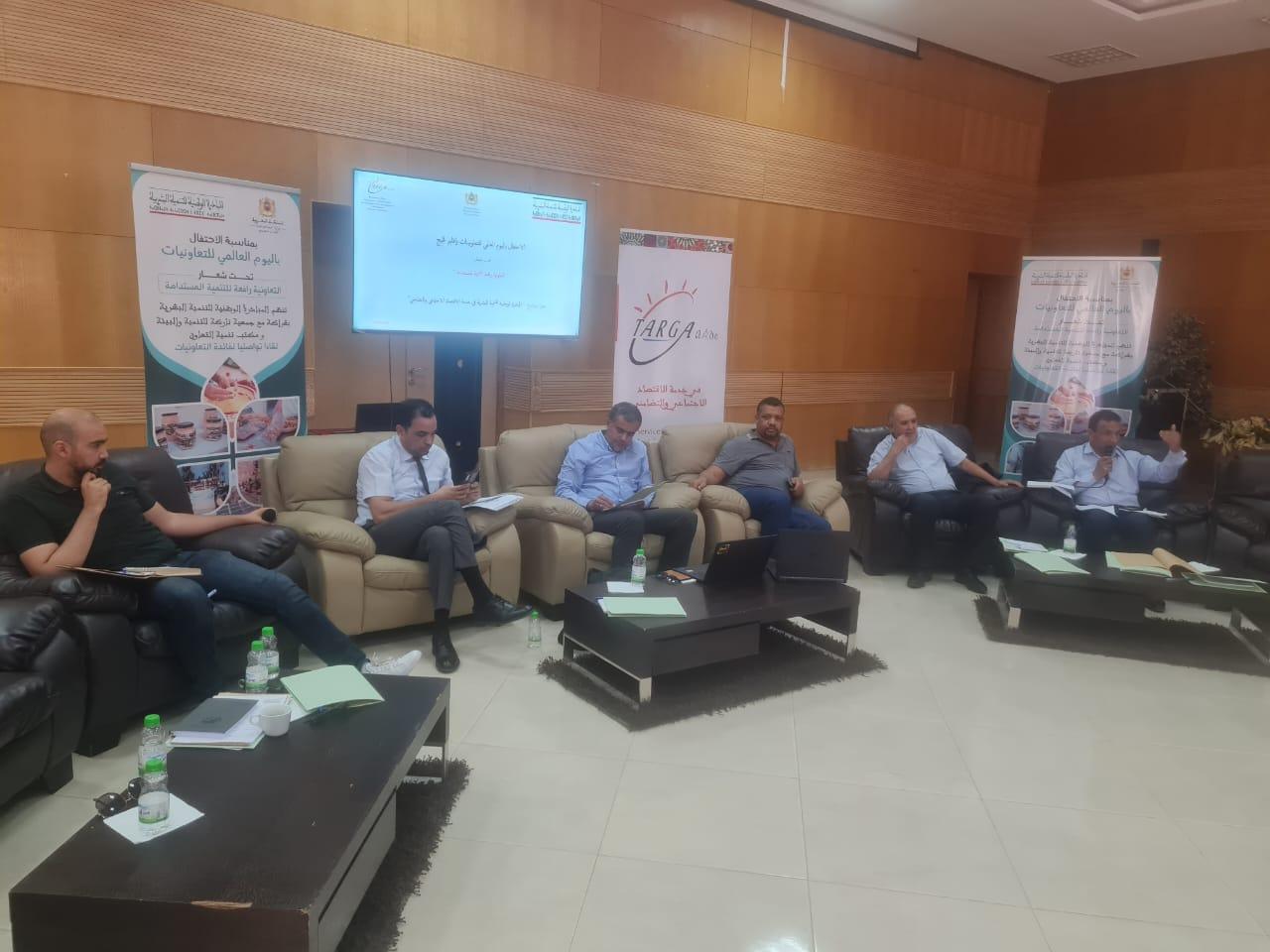 برنـــامج الاحتفال باليوم العالمي للتعاونيــات هذا المنظم تحت شعار : ” التعاونية رافعة للتنمية المستدامة “في موضوع: ” المبادرة الوطنية للتنمية البشرية في خدمة الاقتصاد الاجتماعي والتضامني” تضمن كلمـة افتتاحيــة لكل من رئيس قسم العمل الاجتماعي بعمالة إقليم فجيج و المندوب الجهوي لمكتب تنمية التعـاون بوجدة وممثل جمعية تاركة, تلتها عدة مداخلات منها قــراءة إعـلان بيـان الحلف التعـاوني الدولي و مداخلات كل من علي رزوق : رئيس الفضاء المغربي للاقتصاد الاجتماعي والتضامني حول ” العمل التعاوني في المغرب : الواقع والأفاق”، جلال رمضي: المدير الإقليمي للوكالة الوطنية لإنعاش التشغيل والكفاءات بإقليم فجيج في موضوع ” أية مساهمة للتعاونيات في توفير الشغل ومحاربة الفقر”، أمين بوخى: ممثل الوكالة الوطنية لتنمية مناطق الواحات وشجر الأركان لإقليم فجيج حول ” دور التعاونيات في تعزيز التمكين الاقتصادي للمرأة القروية” و عبد السلام الموقت : خبير- جمعية تاركة في موضوع: “مساهمة المبادرة الوطنية للتنمية البشرية في التهوض بالاقتصاد الاجتماعي والتضامني”,