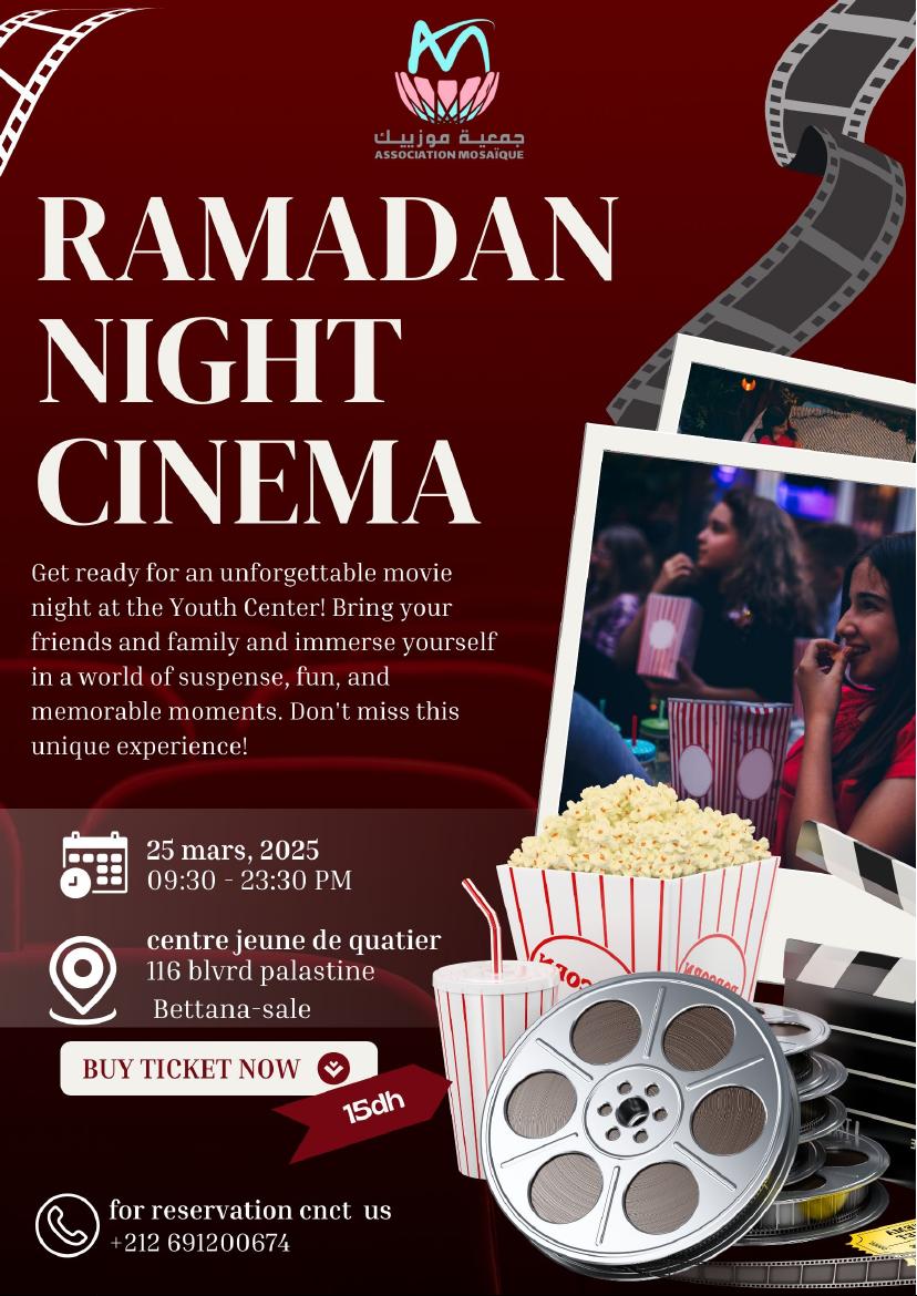 تنظم جمعية موزييك لقاء ثقافي مع شباب مدينة سلا يوم 25 مارس لمشاهدة أفلام سينمائية ومناقشتها ، وتبادل الأراء فيما بينهم والاستماع لهم ، وقد صرحت أمينة السودي رئيسة الجمعية بأن هذه اللقاءات التي تنظمهم الجمعية ، تدخل في نشر الثقافة السينمائية بين الجميع ،لأن لا أحد يمكن أن يتجاهل تأثير السينما على الشباب.