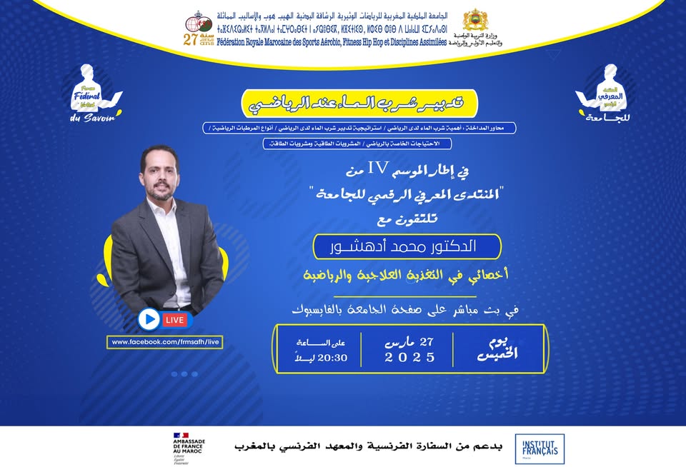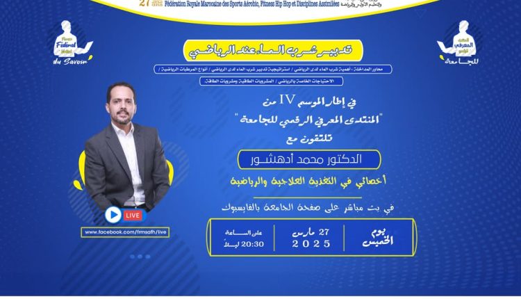 في إطار الموسم 17 من المنتدى المعرفي الرقمي_للجامعة الذي أطلقته الجامعة_الملكية_المغربية_للرياضات_الوثيرية_الرشاقة_البدنية_الهيب_هوب_والأساليب_المماثلة، تلتقون مع الأخصائي في التغذية العلاجية والرياضية، الدكتور محمد أدهشور ، في بث مباشر على الصفحة الرسمية للجامعة على الفايسبوك، يوم الخميس 27 مارس 2025 على الساعة الثامنة والنصف مساءً (20h30) حول موضوع ” تدبير شرب الماء عند الرياضي “.