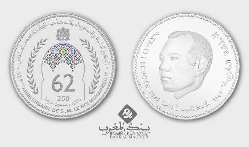 أصدر بنك المغرب قطعة نقدية تذكارية فضية من فئة 250 درهما، وذلك تخليدا للذكرى الثانية والستين لميلاد صاحب الجلالة الملك محمد السادس.