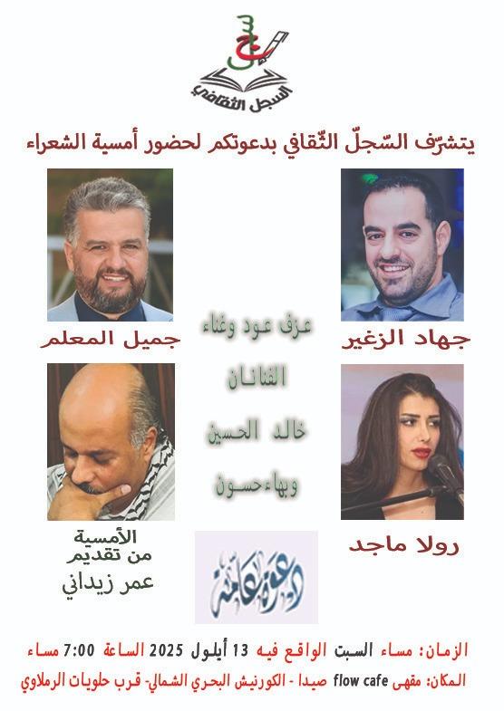يواصل السجل الثقافي بلبنان أنشطته الثقافية والإشعاعية بتنظيم أمسية شعرية يشارك فيها جهاد الزغير وجميل المعلم ورولا ماجد ، إضافة لعازف العود خالد الحسين والفنانة بهاء حسون وذلك يوم السبت 13شتنبر /أيلول 2025 على الساعة الخامسة مساء بمقهى flow بالكونيش البحري الشمالي صيدا بلبنان …