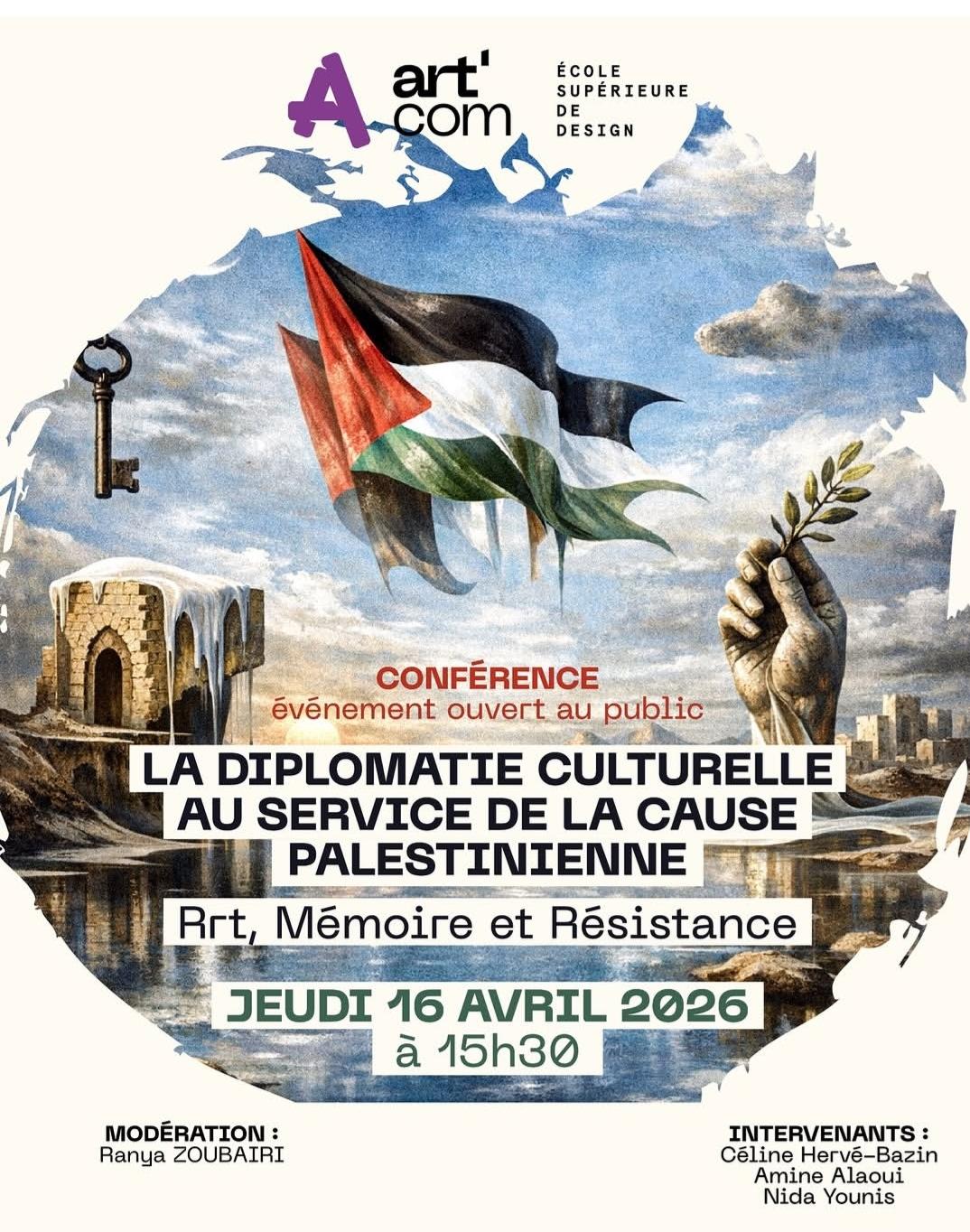 في إطار أنشطة الوساطةالثقافية التي يشرف عليها مختبر البحث والابتكار في التصميم والتواصل ، تنظم مؤسسة أرت كوم سوب، يوم الخميس 16 أبريل 2026 ابتداءً من الساعة الثالثة والنصف بعد الزوال، لقاءً مفتوحاً حول موضوع: الدبلوماسية الثقافية في خدمة القضية الفلسطينية: الفن، الذاكرة والمقاومة.