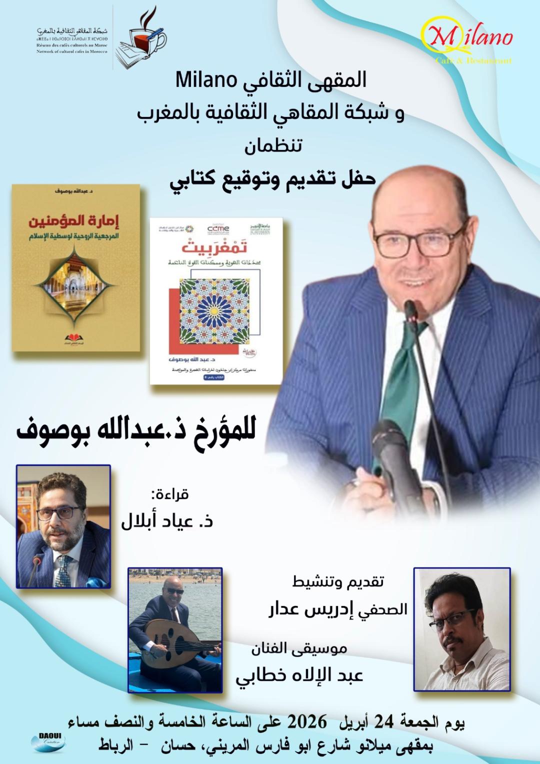 حفل تقديم وتوقيع كتابي * تمغربيت *و *إمارة المؤمنين* للمؤرخ الأستاذ عبد الله بوصوف ،قراءة للأستاذ عياد أبلال ، وتقديم وتنشيط الصحفي إدريس عدار ، ومشاركة موسيقية للفنان عبدالإله خطابي بالرباط على الساعة الخامسة والنصف.