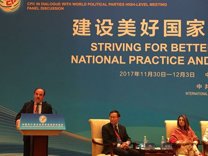 في البداية أود أن أتوجه بالشكر لفخامة الرئيس السيد الأمين العام للحزب الشيوعي الصيني شي جي بين ومن خلاله لقيادة وقواعد الحزب على دعوته لحضور أشغال هذا الملتقى الهام، وأن أعبر عن تقديري وإعجابي بالنموذج الصيني الذي يجسد نجاح أمة عريقة استطاعت أن تستثمر مقوماتها الحضارية والروحية في بناء دولة قوية ما فتئت تشد إليها أنظار الشعوب عبر العالم.