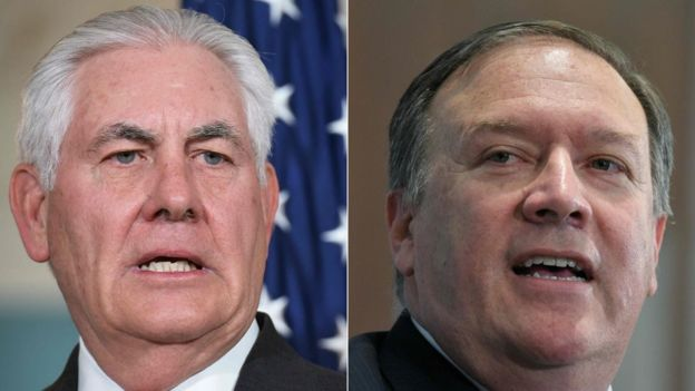 وقال ترامب “مع مايك، مايك بومبيو، لدينا فكر متشابه. أعتقد أن الأمور ستسير بصورة جيدة”. ويقول أنتوني زيركر مراسل بي بي سي في واشنطن إن تيلرسون بدا كما لو كان يسير على جليد هش منذ توليه منصب وزير الخارجية. أضاف زيركر إن موظفي وزارة الخارجية المخضرمين لا يولون كثير من الثقة لتيلرسون، الذي ينظرون إليه على أنه دخيل ليس لديه الكثير من الصلة والمعرفة بالوزارة التي يقودها. وكان تيلرسون في جولة افريقية الأسبوع الماضي، عندما بوغت بإعلان ترامب بأنه سيجري محادثات مع زعيم كوريا الشمالية كيم جونغ أون.