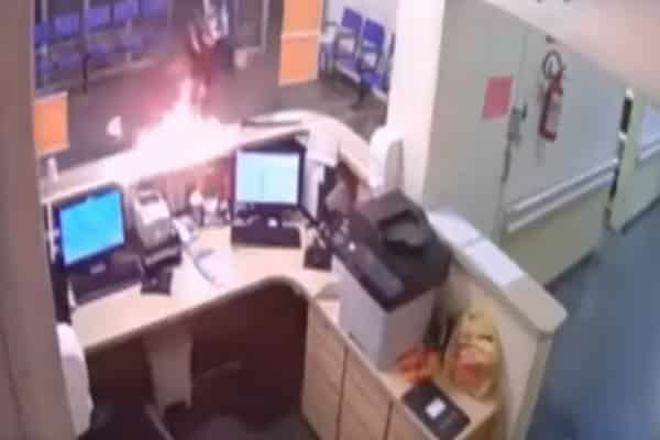 وتداول رواد مواقع التواصل الاجتماعي فيديو لرجل يبدو غاضبًا، وهو ممسك بزجاجة وقود، ثم سكبها على مكاتب موظفي الاستقبال وأشعل النيران فيها تنفيذًا لتهديدات سابقة وفقًا لتقارير إعلامية.