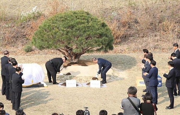 وأهال الزعيم الكوري الشمالي كيم جونغ-أون والرئيس الكوري الجنوبي مون جيه-إن التربة على جذور الشجرة وكشفا عن حجر كتب عليه “زرع السلام والازدهار” فوق اسميهما وألقابهما الرسمية.