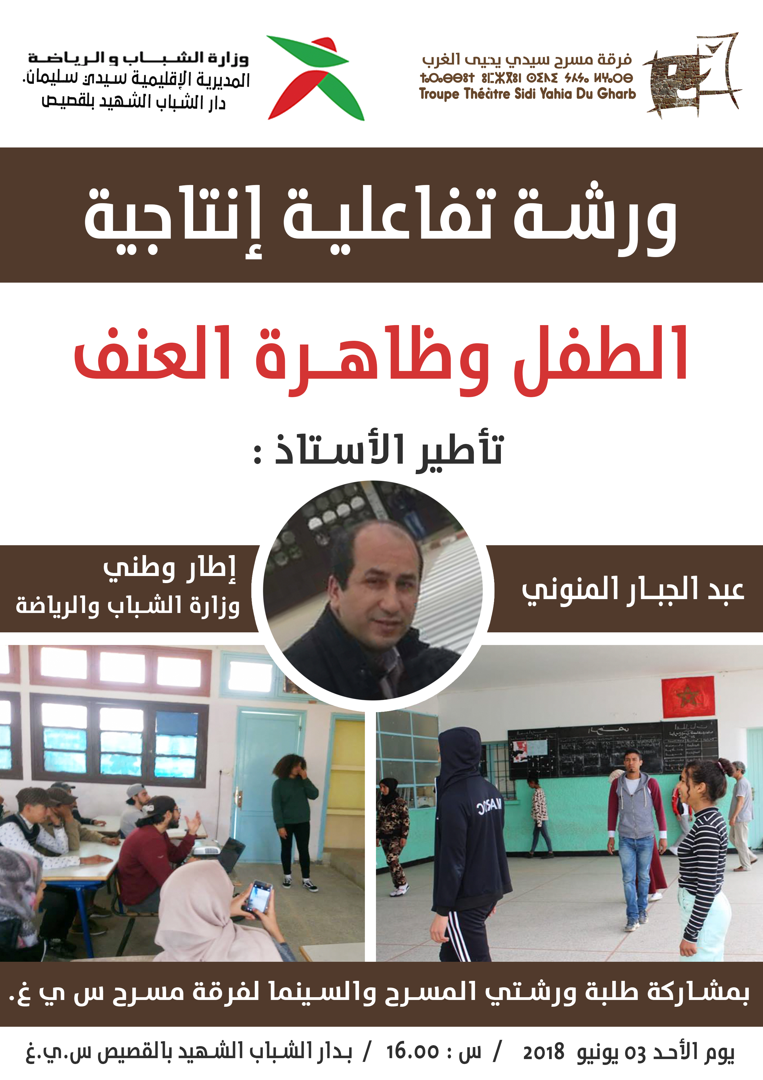 نظمت فرقة مسرح سيدي يحيى الغرب بتنسيق مع دار الشباب الشهيد بلقصيص يوم الاحد الماضي، ورشة تفاعلية انتاجية بمشاركة الاطار الوطني عبد الجبار المنوني وطلبة ورشتي المسرح والسينما لفرقة مسرح سيدي يحيى الغرب.