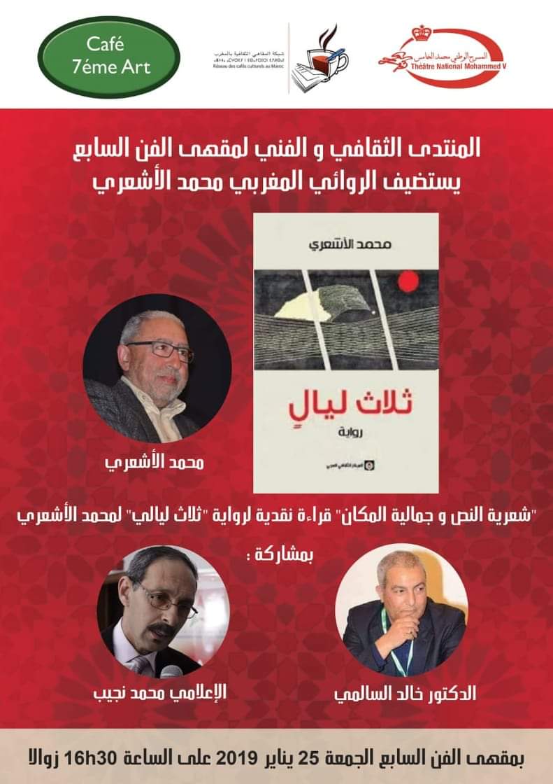 تنظم شبكة المقاهي الثقافية بالمغرب والمنتدى الثقافي والفني لمقهى الفن السابع لقاء مع الشاعر والروائي محمد الأشعري مع توقيع روايته الجديدة “ثلاث ليال” وذلك يوم الجمعة 25 يناير 2019 ابتداء من الساعة الخامسة مساء بمقهى الفن السابع شارع علال بن عبد الله الرباط .