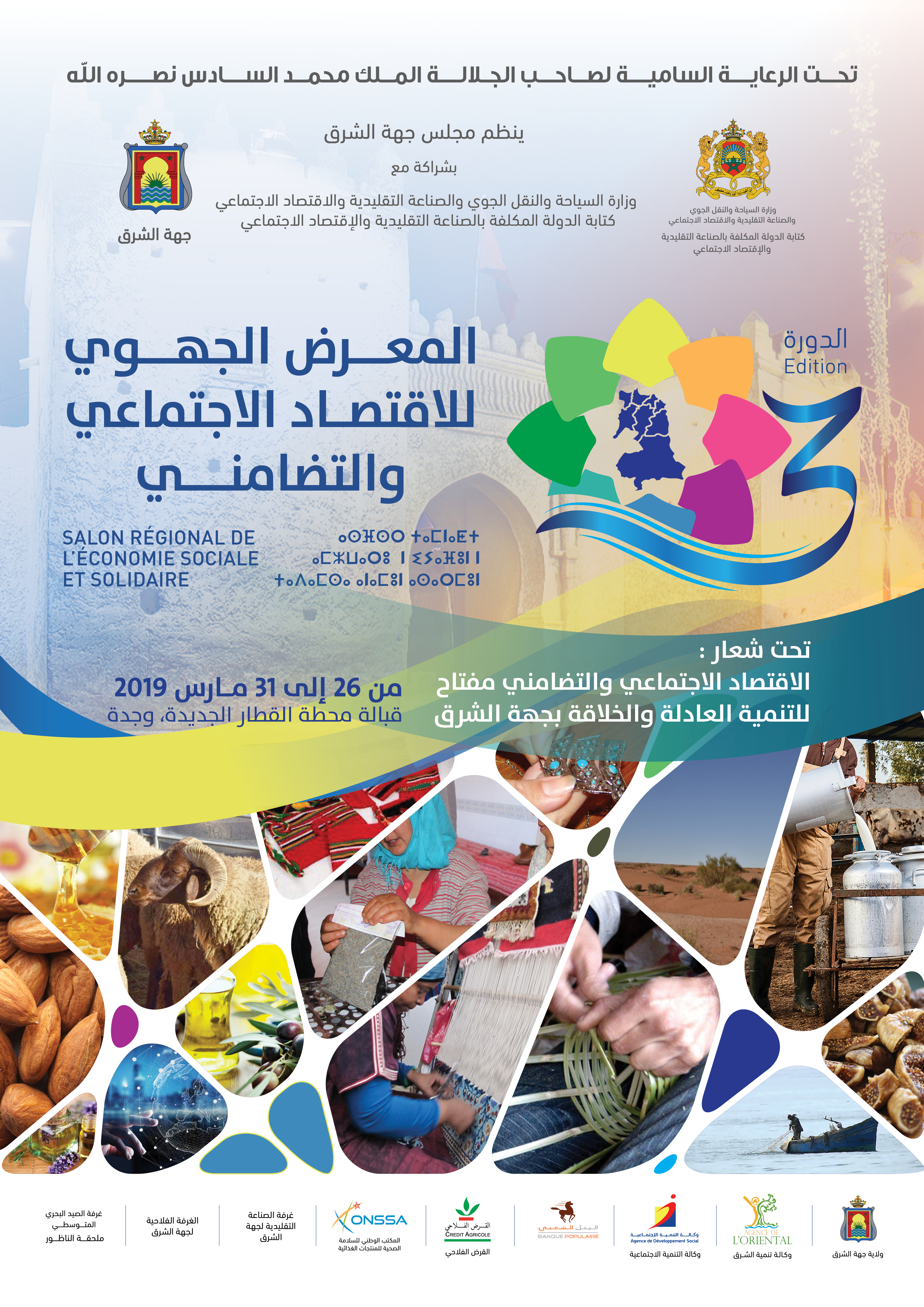 تحت الرعاية السامية لصاحب الجلالة الملك محمد السادس نصره الله، ينظم مجلس جهة الشرق بشراكة مع وزارة السياحة والنقل الجوي والصناعة التقليدية والاقتصاد الاجتماعي – كتابة الدولة المكلفة بالصناعة التقليدية والاقتصاد الاجتماعي، وبتعاون مع ولاية جهة الشرق “ينظم” الدورة الثالثة للمعرض الجهوي للاقتصاد الاجتماعي والتضامني تحث شعار «الاقتصاد الاجتماعي والتضامني مفتاح للتنمية العادلة والخلاقة بجهة الشرق” وذلك من 26 إلى31 مارس 2019 قبالة محطة القطار الجديدة بوجدة.