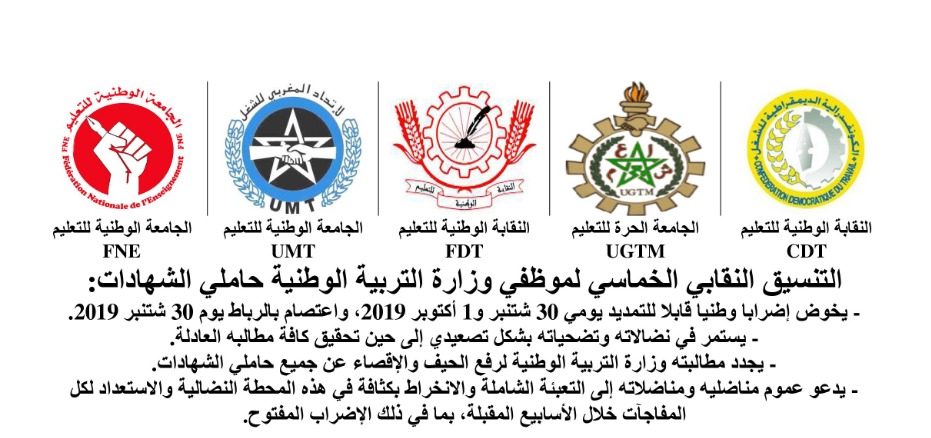 - دعوته جميع موظفي وزارة التربية الوطنية حاملي الشهادات إلى خوض إضراب وطني يومي 30 شتنبر و1 أكتوبر 2019 قابل للتمديد، مع تجسيد معتصم وطني متمركز بالرباط يوم 30 شتنبر 2019، سيعلن عن مكانه وساعة انطلاقه في بلاغ خاص لاحقا.